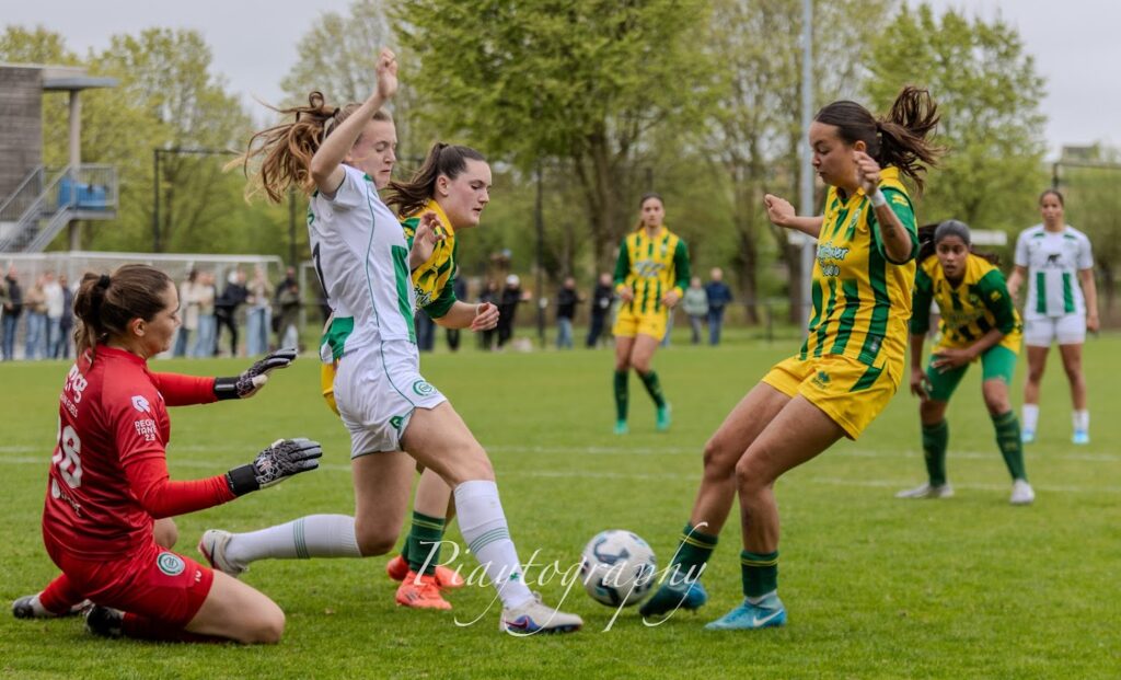 Op het natuurgras van het Sportpark Prinses Irene in Rijswijk, waar de mannen van ADO Den Haag in de zomer de basis legden voor de adembenemende race naar de titel, hadden de Haagse beloften zaterdag tijd nodig om de motor aan de praat te krijgen. Esmée Veerman moest met een goed getimede ingreep eerst een Groningse doorbraak voorkomen, voordat Sienna in ‘t Veld aan de andere kant de keeper een eerste keer aan het werk zette. Daarna wist de thuisploeg voor steeds meer gevaar te zorgen. In stelling gebracht door Fenna van der Net zag Diya Poedai een uithaal geblokt. Uit de daaropvolgende corners dwong Katja Piay de Groningse sluitpost twee keer tot een redding. Onder het motto ‘niet geschoten, altijd mis’ probeerden Veerman en Amy Dekkers het van grote afstand, zonder resultaat.