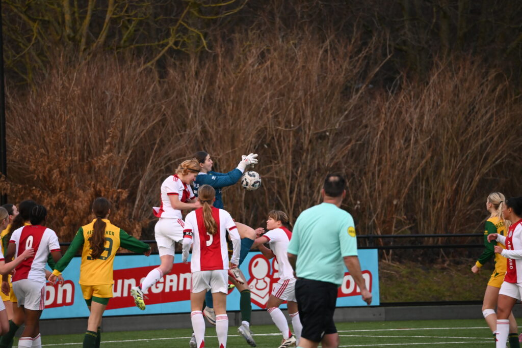 Aan de overkant bleef de Haagse defensie – Maira Boosman, Esmée Veerman, Amy Dekkers en Katja Piay – de oppositie voortdurend de baas. Waar nodig greep Buijs steeds soeverein in. De gelijkmaker kwam twee minuten voor tijd uit de lucht vallen. Een corner woei via een Amsterdams hoofd pardoes in de bovenhoek. Toen Boosman in blessuretijd gehavend naar de kant moest en ADO Den Haag door moest met tien tegen elf, leek zelfs die gelijke stand nog in gevaar te kunnen komen. Zover lieten haar ploeggenoten het echter niet komen.