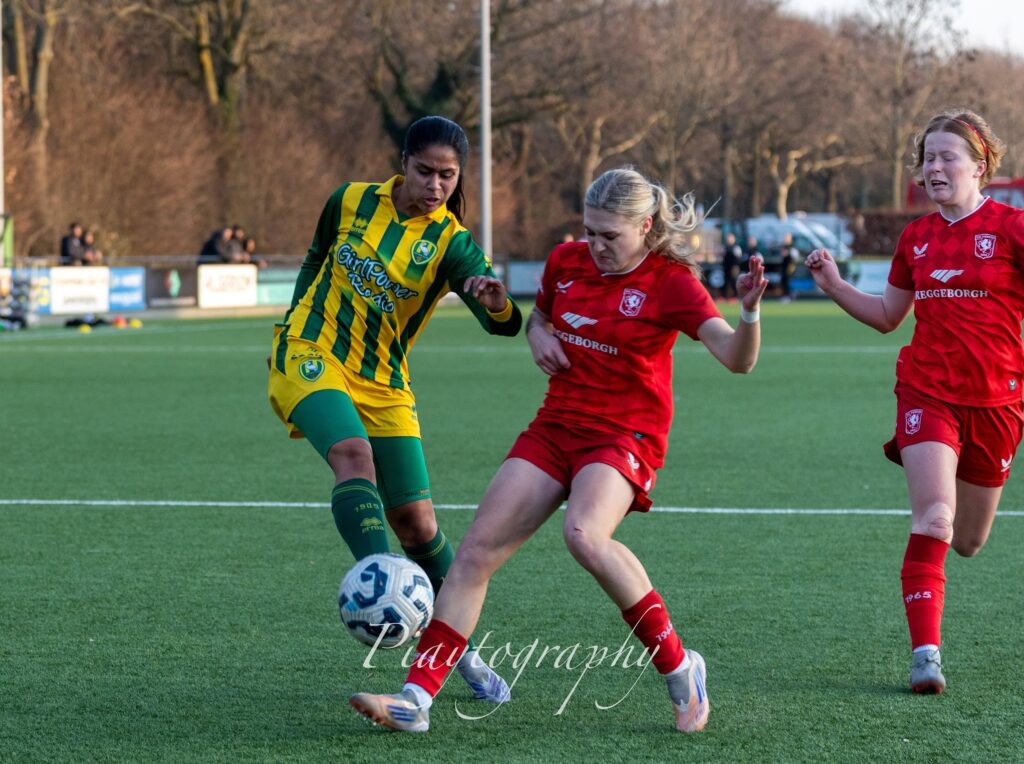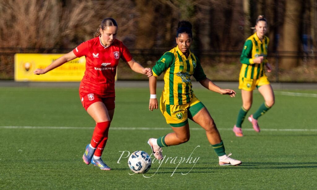 Na de verdiende promotie naar de bovenste helft van de competitie (door de KNVB Eerste Divisie gedoopt) begon ADO Den Haag de tweede helft van het seizoen onder een aangenaam lentezonnetje in Rijswijk zoals elke wedstrijd voor de winterstop: met een bliksemoffensief. FC Twente kwam al in de eerste minuut goed weg toen een ragfijne combinatie tussen Sienna in ‘t Veld en Isa van Schaik net geen treffer opleverde. Drie minuten later was het toch bingo. Loewé Boid gaf de bal met veel gevoel voor en topscorer In ‘t Veld was de keeper te snel af: 1-0. De thuisploeg bleef de Tukkers daarna met succes opjagen op eigen helft en creëerde kansen genoeg om de voorsprong te vergroten. Van Schaik stuitte dicht bij het doel op de goalie. In ‘t Veld mikte in de armen van de doelvrouw. En na een flitsende aanval vuurde Fien Reijers op aangeven van Famke Krijger in volle vlucht naast.